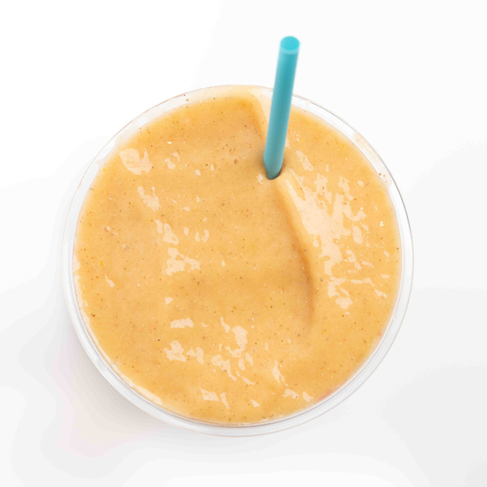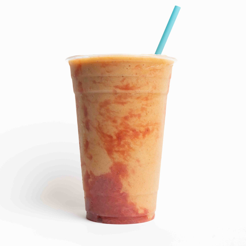 Coconut Water, Mango, Strawberries, Avocado, Chia Seeds, Ginger, Collagen Peptide, Lemon Juice, Strawberry Glaze